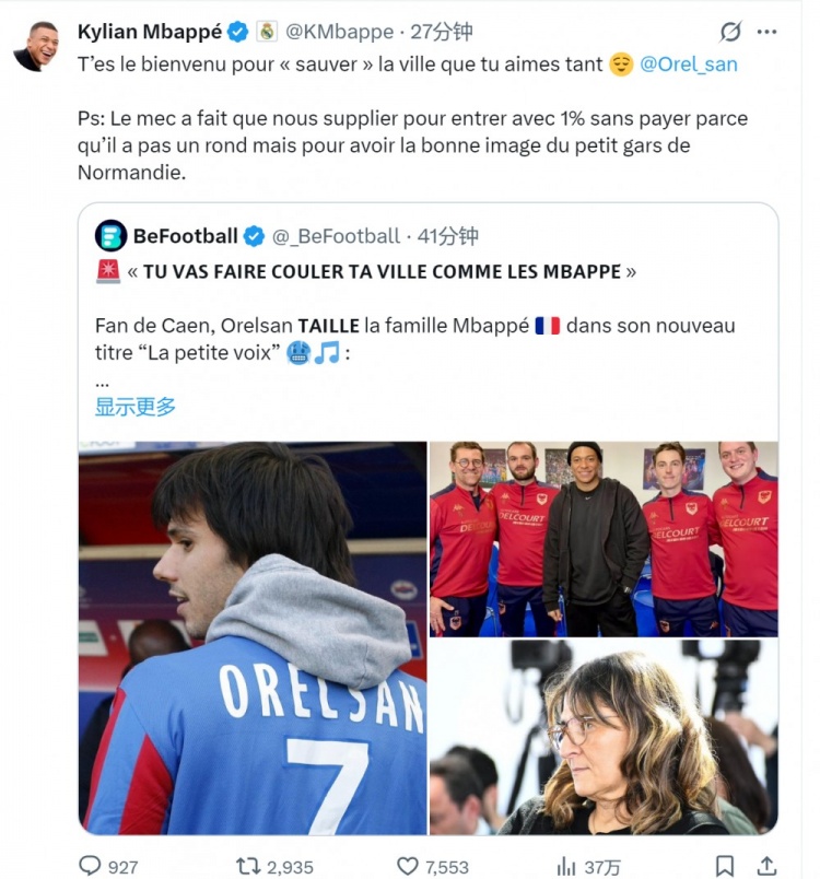 11月7日讯 卡昂队球迷、音乐人奥雷尔桑在新歌中嘲讽姆巴佩一家,身为卡昂俱乐部老板的姆巴佩社媒发文回怼。